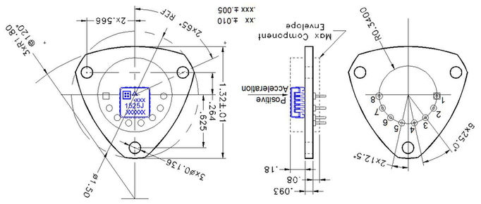 型號2225的輸入軸垂直于PCB。地震中心位于LCC加速計(jì)內(nèi)PCB的中心,位于PCB頂部上方約0.110英寸(2.75 mm)處,PCB頂部是2225的參考表面。