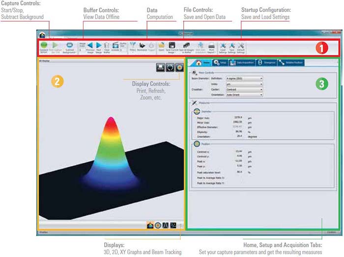 3 - 主頁和設(shè)置選項卡 —— 軟件右側(cè)包含主頁、設(shè)置和數(shù)據(jù)采集選項卡。主頁選項卡允許用戶選擇針對其測量的主要控制(光束直徑清晰度、瞄準器中心和定向),并在其下顯示測量結(jié)果。設(shè)置選項卡允許用戶設(shè)置測量參數(shù)(曝光時間、圖像定向和平均值、主動區(qū)等),數(shù)據(jù)采集選項卡允許用戶保存測量值或測量值及完整圖像,并輸入采集的采樣率和總持續(xù)時間。單擊計算面板中的顯示/隱藏選項按鈕,還可調(diào)出具有控制功能的更多選項卡。
