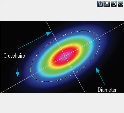 二維顯示屏 —— 二維顯示屏可顯示瞄準器(設(shè)置到長軸和短軸或沿指定角度方向)和光束的測定直徑。這些直徑隨所選清晰度(4-sigma、半峰全寬、1/e2 等)而變化,該顯示屏可以打開或關(guān)閉。打印屏幕按鈕允許用戶以 BMP 格式保存當前屏幕的圖片。