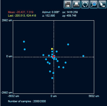 光束跟蹤顯示屏 —— 光束跟蹤顯示屏允許用戶對光束在傳感器上中心位置的變化進行可視化顯示。其可顯示最后計算位置和以前的位置,除非用戶重置視圖。另外還可顯示所有計算值的平均數(shù)位置,并提供有關(guān) X 軸和 Y 軸位置穩(wěn)定性的信息。此工具非常適合于監(jiān)控光束隨時間變化的指向穩(wěn)定性。