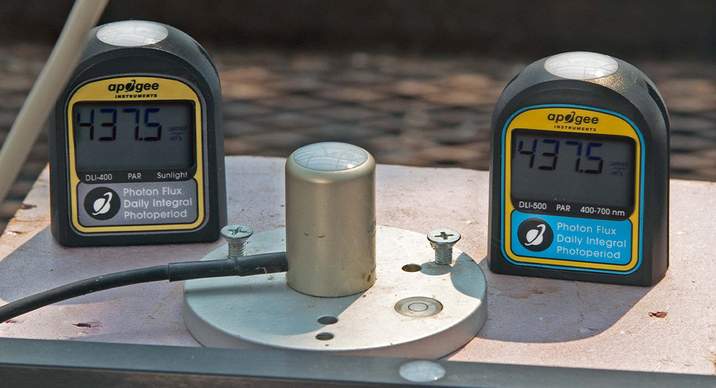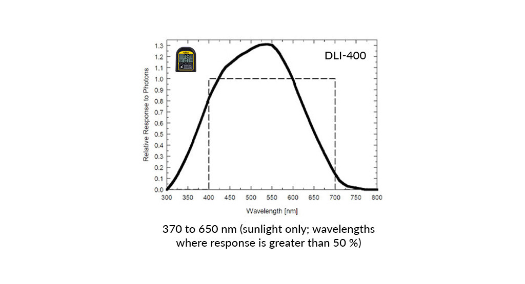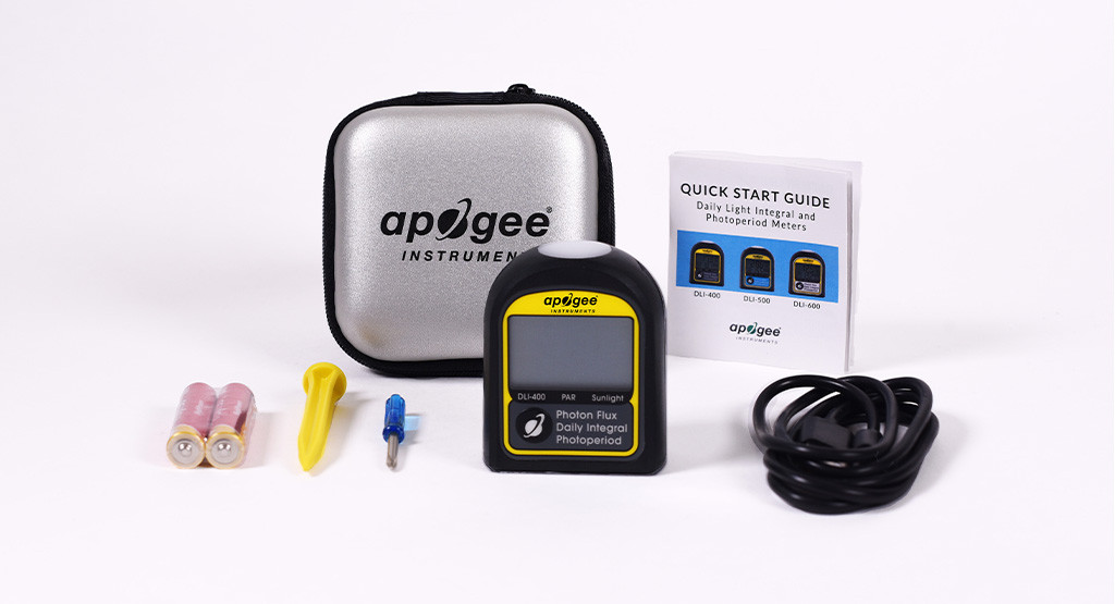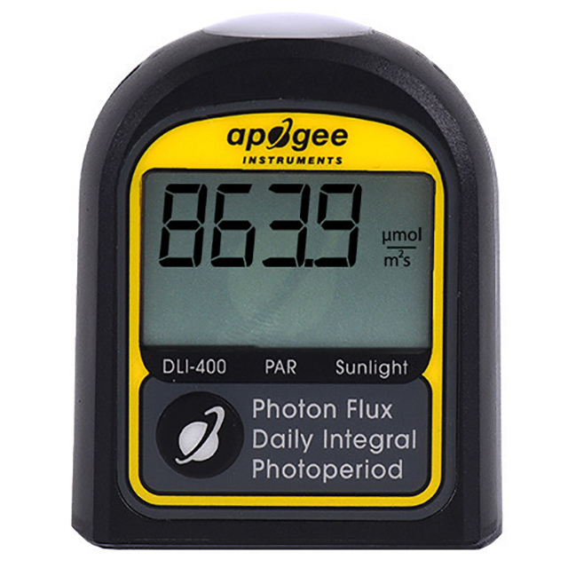 DLI-400 日光計是2022 年的新產(chǎn)品,用于抽查光合有效輻射(PAR;400–700 nm)水平并測量日光積分(DLI) 和光周期。DLI-400 是一種低成本選項,僅在陽光和某些寬帶光源下準(zhǔn)確。PAR、DLI 和光周期影響植物的生長和發(fā)育,通常在溫室和生長室中測量它們以幫助進行光照管理和決策。DLI是指24小時內(nèi)入射在一個平面上的PAR或擴展PAR(ePAR)的總量,單位為每天每平方米的摩爾數(shù)。光周期是 24 小時內(nèi) PAR 或 ePAR 入射的總時間,以小時 (h) 為單位表示。