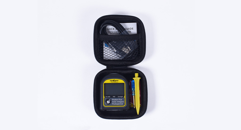 堅固耐用且隨時可用:DLI-400 堅固耐用,防護 等級為 IP65,可承受惡劣和潮濕的環(huán)境,可以隨身攜帶進行抽查,直接放置在任何水平表面上,或通過連接到常用的相機三腳架、夾具或使用底部的標(biāo)準(zhǔn) ?-20 螺紋端口進行樁子。DLI 儀表由鑄造丙烯酸擴散器(過濾器)、光學(xué)過濾器、光電二極管、信號處理電路和安裝在 ASA 塑料外殼中的 LCD 顯示屏組成。每個 DLI 包裝都包括儀表、一個保護性手提箱、兩節(jié) AAA 電池、一個快速入門說明指南、一把螺絲刀、一個便于安裝的土壤釘和一根 USB-C 電纜,用于將儀表存儲的數(shù)據(jù)作為 CSV 文件下載到計算機。