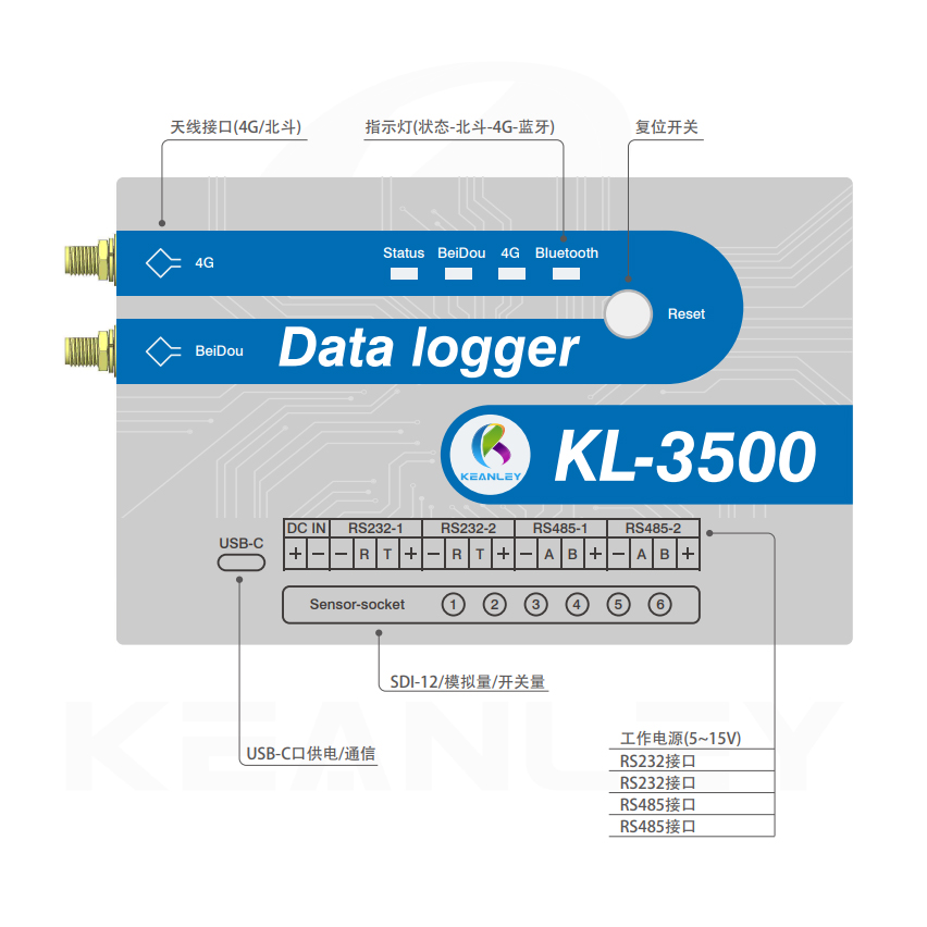 KL-3500專門用于SDI協(xié)議和DDI模式,RS485和RS232以及模擬量和脈沖量的傳感器。數(shù)據(jù)記錄儀有12個插接口(6個傳感器接口,2個帶供電的485,2個帶供電的232,1個大氣壓溫度接口,一個北斗數(shù)據(jù)口)具體參考軟件界面里的接口說明,一個2P的3.81端子供電口,2個TYPE-C接口(都可以供電和通信)1個復(fù)位按鈕,4個狀態(tài)指示燈,D9為運行狀態(tài)指示燈,D10為北斗狀態(tài)指示燈,D11為4G狀態(tài)指示燈,D12為藍牙狀態(tài)指示燈,2個天線接口,一個為4G通信天線,一個為GPS天線,底部是電池倉可使用8節(jié)鎳氫電池或堿性電池。