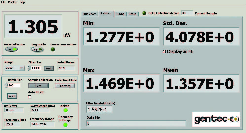 在“統(tǒng)計(jì)數(shù)據(jù)”選項(xiàng)卡下,有 4 個(gè)包含所選批次統(tǒng)計(jì)數(shù)據(jù)的大窗口,分別為:小值、大值、標(biāo)準(zhǔn)差和平均數(shù),以工程計(jì)數(shù)法表示。用戶可選擇以瓦或 % 來顯示標(biāo)準(zhǔn)差。另外還有一個(gè)窗口可以根據(jù)用戶選擇的“Tau 過濾器”(0.100 至 100 秒)顯示數(shù)字帶通過濾器的帶寬。設(shè)置時(shí),應(yīng)使用較小的時(shí)間常數(shù);進(jìn)行測量時(shí),應(yīng)使用較大的時(shí)間常數(shù),特別是在儀器的量程低端。