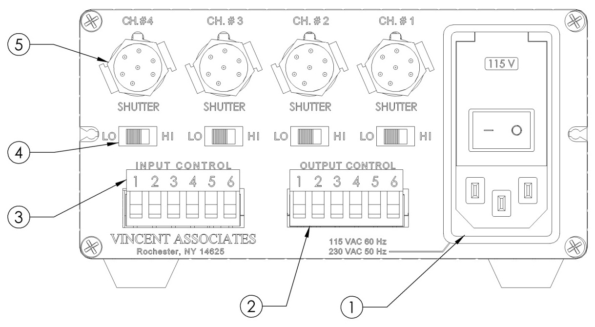 LO/HI 選擇滑動開關(guān) (4) “HI” 位置允許為 35 mm 和更大的快門選擇合適的脈沖能量。“LO” 位置適用于 25 mm 和更小光圈的快門。每個通道一個。