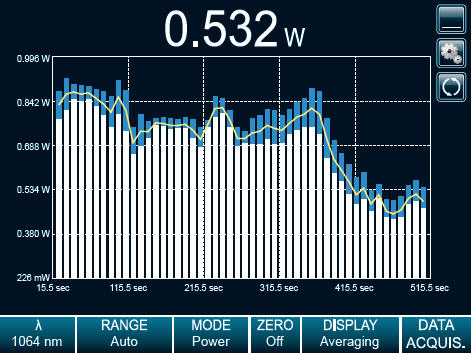這個非常特別的模式特別適用于顯示激光器隨時間的變化趨勢。設置每批的點數,然后讓 MAESTRO 確定每批的最小值和最大值。每批的平均值之后會出現一條黃色曲線,其在屏幕上顯示為條形。條形白色和藍色部分(分別對應最小值和最大值)相差越大,激光器的穩(wěn)定性越差。