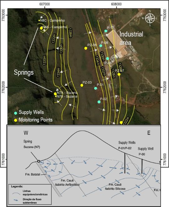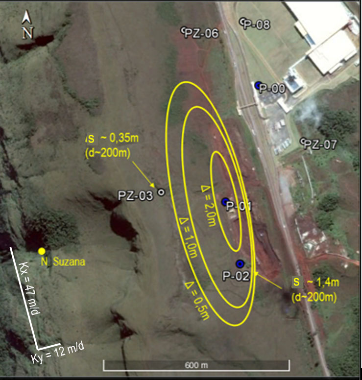The aquifer’s hydrodynamic parameters were determined, and the results showed that the combined drawdown cone resulting from pumping the three wells simultaneously was fairly restricted to the area where the wells are located, with no direct interference in the springs. The long term monitoring of all wells demonstrated that the groundwater divide did not change, indicating that the drying up of the springs was a consequence of the lower than usual precipitation rates that occurred in the previous three years. That was corroborated by the fact that as the precipitation rate during the monitored year was closer to average rates, groundwater levels went up and spring flow rates recovered.