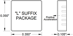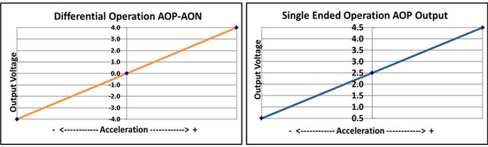 The Model 1521 produces a differential +/-4 volts output voltage or single ended mode, 0.5 – 4.5 volts full scale, the value of which varies with acceleration as shown in the figures below. The sensitive axis is perpendicular to the bottom of the package, with positive acceleration resulting from a positive force pushing on the bottom of the package. The seismic center is located on a centerline through the dual sense elements and halfway between them. The internal electronics effectively cancel any errors due to rotation.