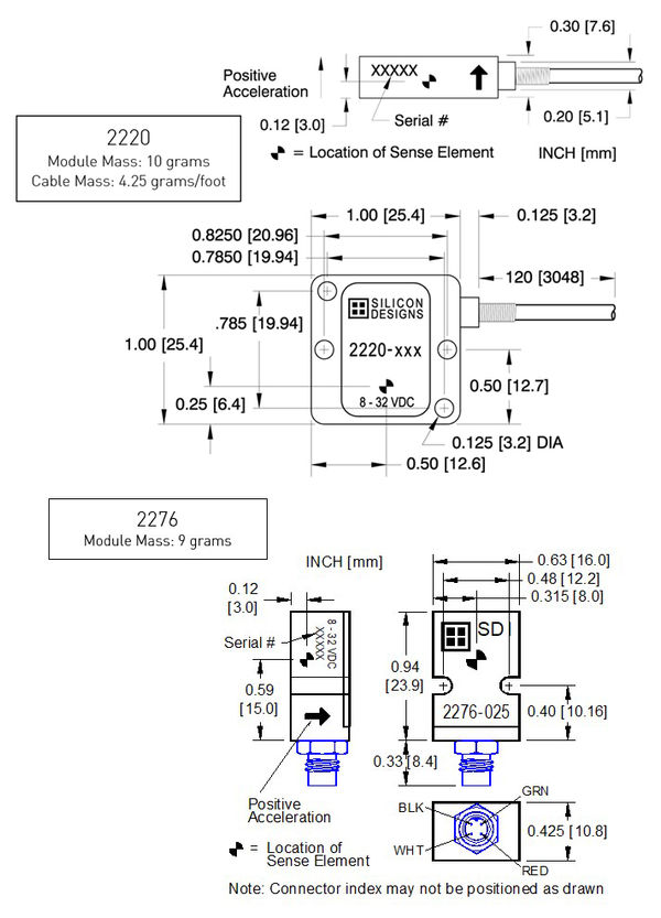 The 2220 comes in a traditional 1-inch square package with a 10' integrated cable and is operationally identical to the 2276, the small footprint device designed for tight spaces. The 2220 and 2276 feature a hermetically sealed, low noise SDI Model 1522 surface mount accelerometer, which is individually tested, programmed, calibrated and verified in a climate chamber to ensure the greatest accuracy in thermally volatile conditions. The 2220 and 2276 include initial calibration reports.