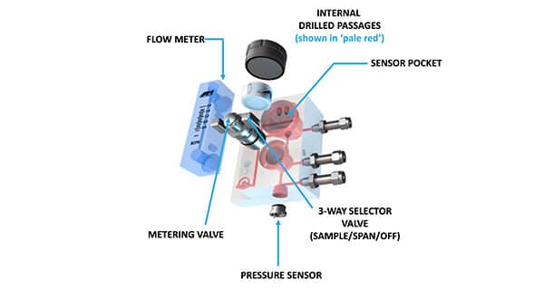 ELIMINATOR CELL BLOCK | Contains a Complete Sample System with all components, including the flow meter, metering valve, pressure sensor and 3-way Selection (Sample/Span/Off) Valve, fully integrated | |