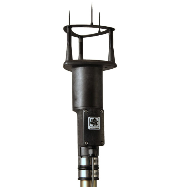 The YOUNG Model 86106 Ultrasonic Anemometer measures horizontal wind speed and direction. This lightweight and compact sensor features durable, corrosion-resistant construction with sensitive ultrasonic transducers secured in a streamlined molded frame. Each sensor is fully wind tunnel tested and calibrated to provide accurate wind measurement over a wide operating range. The sensor is preconfigured to output NMEA serial data (RS-485, 4800 baud) although RS-232 and a variety of output formats are also available. Analog voltage outputs are provided for wind speed and wind direction. 4-20 mA current signals are available for each channel and are well suited for long cable runs or for industrial settings where noise immunity is important.* The sensor mounts on a standard 1-inch IPS pipe. A mounting orientation ring is included that engages with the base of the sensor to retain orientation when the sensor is removed for maintenance. Terminations are made in a junction box at the base of the sensor by small clamp-style connectors (no special connectors are required).