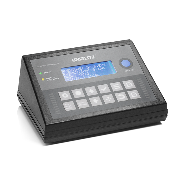 The AIC10 is a tabletop motorized iris diaphragm (auto iris) controller designed for use with the Uniblitz AI25 Auto Iris. The AIC10 features an intuitive button array and digital user interface, allowing it to operate the iris via a modified serial command protocol. When equipped, the AIC10 will also operate the AI25’s optional high-speed shutter attachment independently from the iris. The shutter’s electronic sync allows the AIC10 to indicate the shutter’s state.