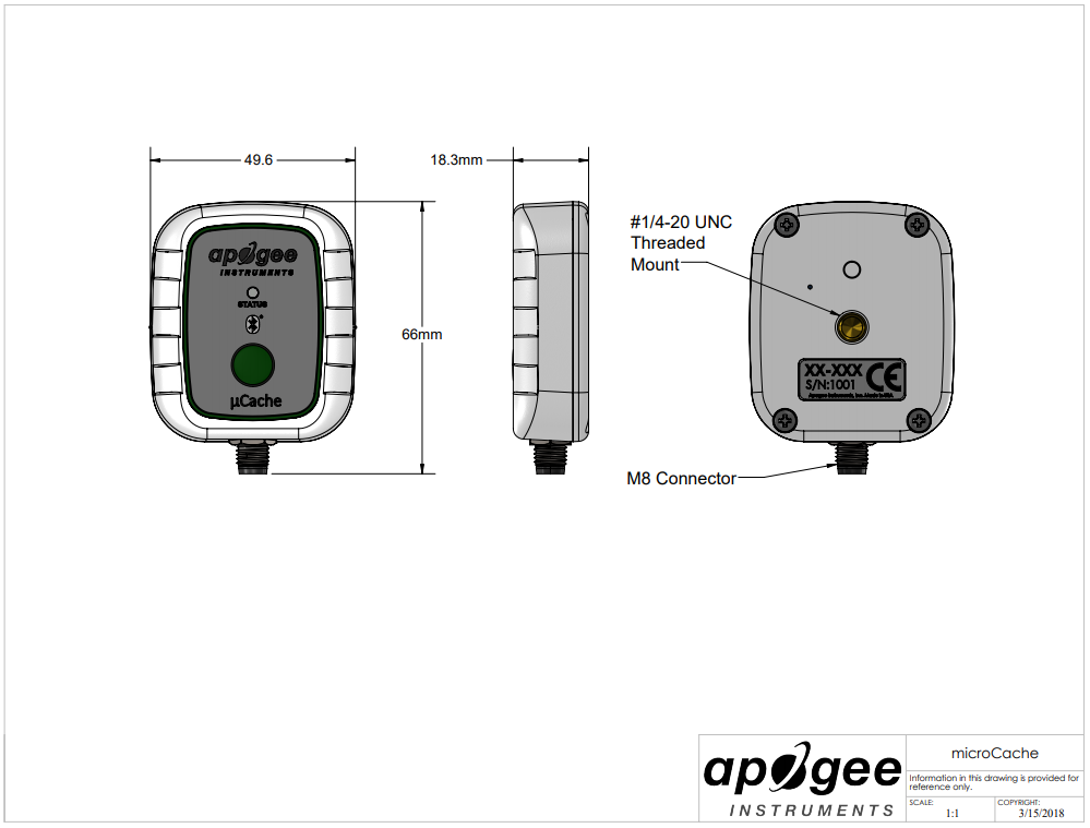 The new Apogee microCache (μCache) is a ruggedized, battery-powered, Bluetooth® Low Energy, single-sensor datalogging device that can be used with Apogee's SQ-110 Original Quantum, SQ-500 Full-spectrum Quantum, SQ-620 Extended Range PFD sensor, SQ-640 Quantum Light Pollution sensor, SP-700 Albedometer, S2-141 PAR-FAR sensor, S2-131 Red - Far-red sensor, SP-110 Silicon-cell Pyranometer, SP-510-SS and SP-610-SS Thermopile Pyranometers, SU-200 UV-A sensor, and the SI-100 Series of Infrared Radiometers.