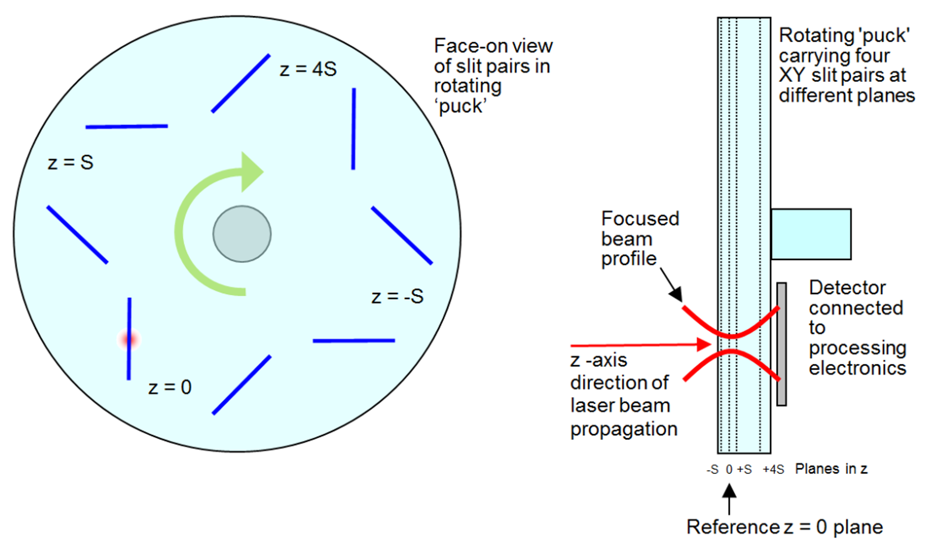DataRay’s BeamMap2 represents a radically different approach to real-time beam profiling. It extends the Beam'R2’s measurement capabilities by allowing for measurements at multiple locations along the beam’s travel. This real-time scanning slit system uses XY slit pairs in multiple Z planes on a rotating puck to simultaneously measure four beam profiles at four different Z locations. The BeamMap2’s unique design is most advantageous for real-time measurement of focus position, M2, beam divergence, and pointing.