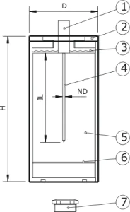 The plastic material is incorporated in a metal protection casing (2). A plug (7) is provided for sealing purposes. In order to guarantee perfect contact between needle (1) and reference material (5), the metal casing is filled with a fluid, glycerol (3). An additional hole (6) is provided in order to be able to perform checks of material stability with thin needle probes. The user is recommended to send the CRC to Hukseflux for a check of material stability every 5 years.