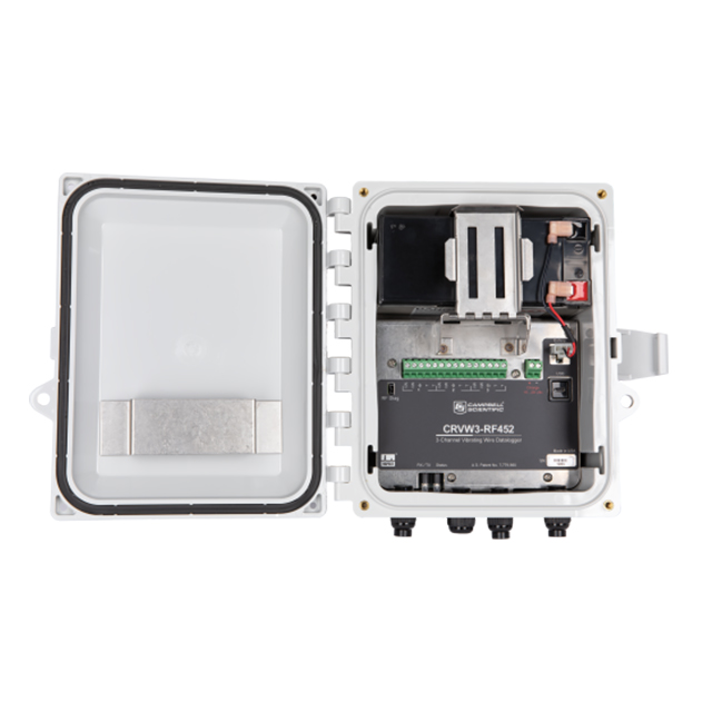 The CRVW3 is a self-contained, low-cost, three-channel vibrating wire data logger. It is designed to be an independent data logger, or a component of your larger radio-linked data-acquisition network when it is configured with available wireless communication options. The CRVW3 includes a factory-integrated power supply and a weatherproof enclosure.