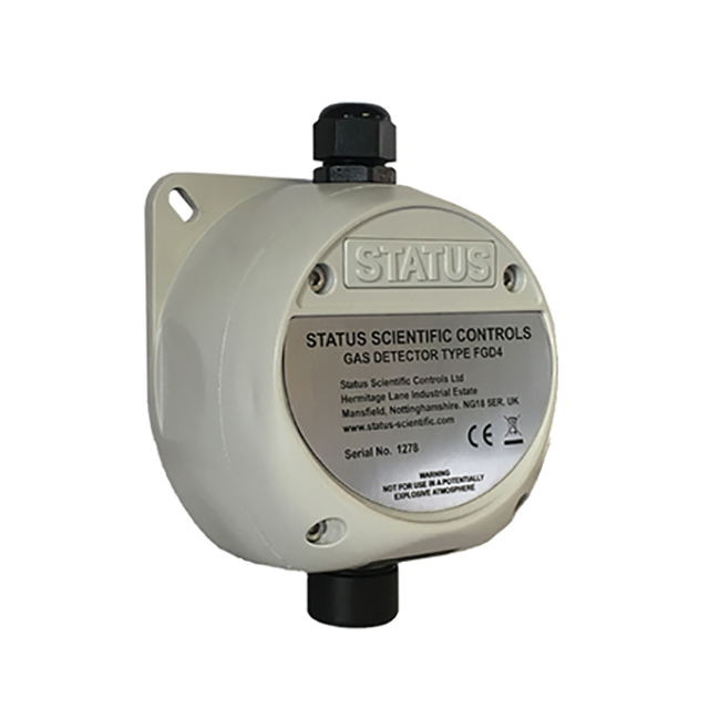 The FGD4 series of gas detectors are powered from an 8 to 24 volts dc power supply using the industry standard 4 to 20mA two-wire current loop to transmit the gas level to a separate control panel such as the Status Scientific Controls LC Series. The Carbon Dioxide version uses Infrared gas detection technology and requires a third connection to power the infrared sensor.