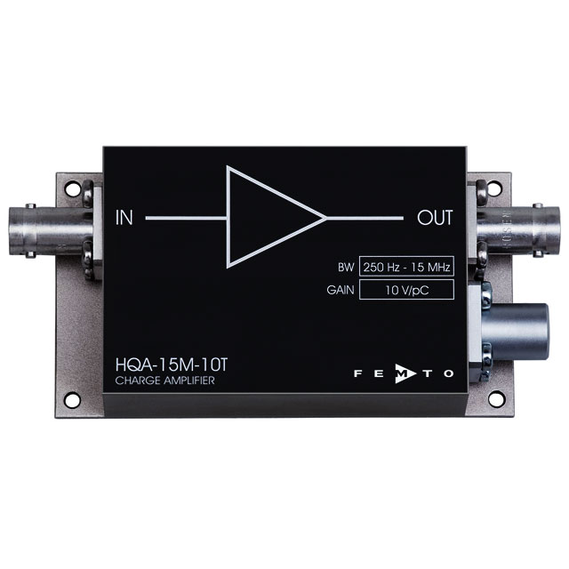 The HQA-15M-10T was developed for AC charge sources such as tuning fork crystals and longitudinal resonators. The amplifier is characterized by a very low-noise design and high gain in order to achieve excellent sensitivity for charge measurements down to the pico and femtocoulomb range. In contrast to some other amplifiers, the HQA-15M-10T does not require cooling, which results in a much more compact design and easier handling. The small housing enables use near the signal source and thus avoids signal interference from long cables. After all, the large bandwidth from 250 Hz to 15 MHz is ideal for versatile use with a large selection of suitable signal sources.