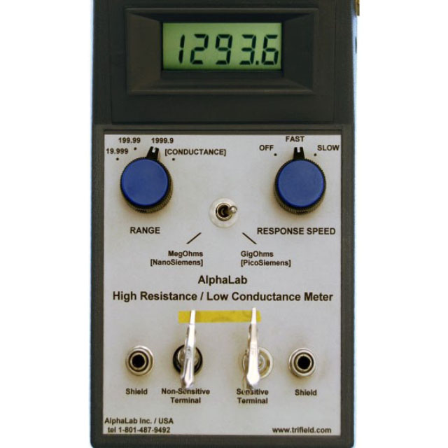The zero-ohms offset knob must first be set correctly. Plug the short alligator clips into the two terminals. The alligator clip with the larger diameter plug goes into the “Non-Sensitive Terminal”. To avoid electrostatic damage to the meter, it’s best to touch one of the two “shield” jacks before plugging in the “Sensitive Terminal”, and to do that anytime just before touching the “Sensitive Terminal”. Connect the alligator clips together by rotating them until they touch, and then clip one on the other. Turn the RANGE knob to any one of the numbers (but not to CONDUCTANCE), and the UPDATE SPEED knob to FAST (this will also turn the meter on). Note the knob sticking out of the right side of the meter. There is a hole in the case just next to that knob. Use a small screwdriver (included) to adjust the control at the bottom of the hole until the display reads zero. This adjustment will probably never need to be done again, but you should check once or twice a year to see if it really remains zero.