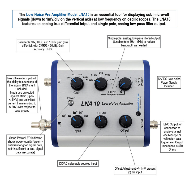 Selectable gains are 10x, 100x, 1000x (true differential, with CMRR > 90dB). Also positive and negative single-ended inputs can be selected, as well as reference ground. Gain accuracy: +/-1%. (The LNA 10 does not include a 1x gain.)
