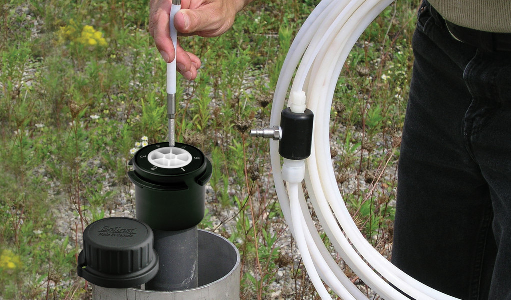 The Micro Double Valve Pump has a remarkably small and flexible design. It is a pneumatic pump that uses coaxial PTFE tubing to give high quality samples. At 3/8" (10 mm) diameter, it is small enough to fit in 1/2" (13 mm) ID tubing such as in Waterloo Multilevel System 5/8" open tubes, as well as channels of the Solinst Model 403 CMT Multilevel Systems. Ideal for low flow groundwater monitoring in narrow applications.