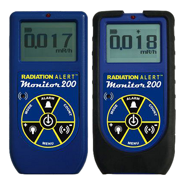 The Monitor 200 measures alpha, beta, gamma and x-rays. Its digital display shows readings in your choice of CPM, CPS, μSv/hr, mR/hr or in accumulated counts. It has a digital display, a red count light and a beeper that sounds with each count detected. Other features include an adjustable timer and selectable alerts. With the free Observer USB Software Family, you can set up computer alarms, calibrate your instrument and download your collected data from the internal memory for easy reporting. Bluetooth is now available for use with BLE APP and Rad Responder.