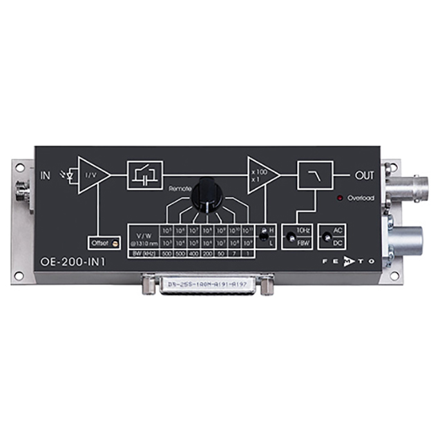 The OE-200 series of variable gain photoreceivers is designed for a great variety of applications requiring the fast and precise measurement of small optical signals. By combining a low noise transimpedance amplifier with a silicon or InGaAs photodiode a broad wavelength range from 190 nm up to 1700 nm is covered. The integrated amplifier offers adjustable gain from 103 to 1011 V/W and thus allows the measurement over a wide dynamic range from ca. 100 fW up to 2 mW optical input power. Its high sensitivity is achieved by a low noise design resulting in a noise equivalent power (NEP) of minimum 6 fW/√Hz. Many additional features like switchable signal filters, an offset adjustment and the capability of manual and opto-isolated remote control by a PC make the OE-200 the most versatile photoreceiver in its class.