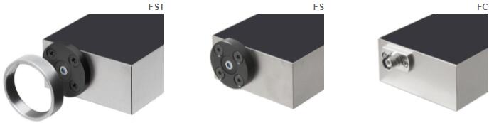 Pic. 1: FST input flange with 1.035"-40 external thread and coupler ring with internal thread;Pic. 2: FS input with 25 mm round flange;Pic. 3: FC input with permanent/fixed PC/APC coupling.