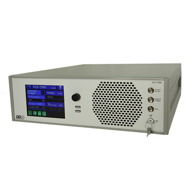 The PCX-7500 is an air-cooled, high power pulsed current source designed to drive laser diodes, bars, and arrays. The output current can be set from 10 A to 450 A, compliance voltage is 48 V to 54 V. The pulse width is adjustable between 4 μs to 5,000 μs, with a frequency of 8 Hz to 10,000 Hz.