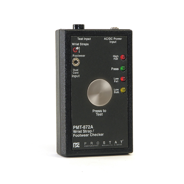 The PMT-872 is a unique, highly portable, battery operated multi-function PASS/FAIL performance verifier. It confirms the operational resistance range of wrist straps, heel straps and ESD controlled footwear. The PMT-872 features a large test button, audible PASS BEEP with Green PASS light, Red LOW and HIGH Fail lights, and yellow battery low indicator. Additional connections are provided for an optional AC-DC Power adapter and for testing dual conductor wrist straps. A front panel toggle switch allows testing of wrist straps and footwear at one station. A footwear test plate, snap connector, and lead can be purchased separately.