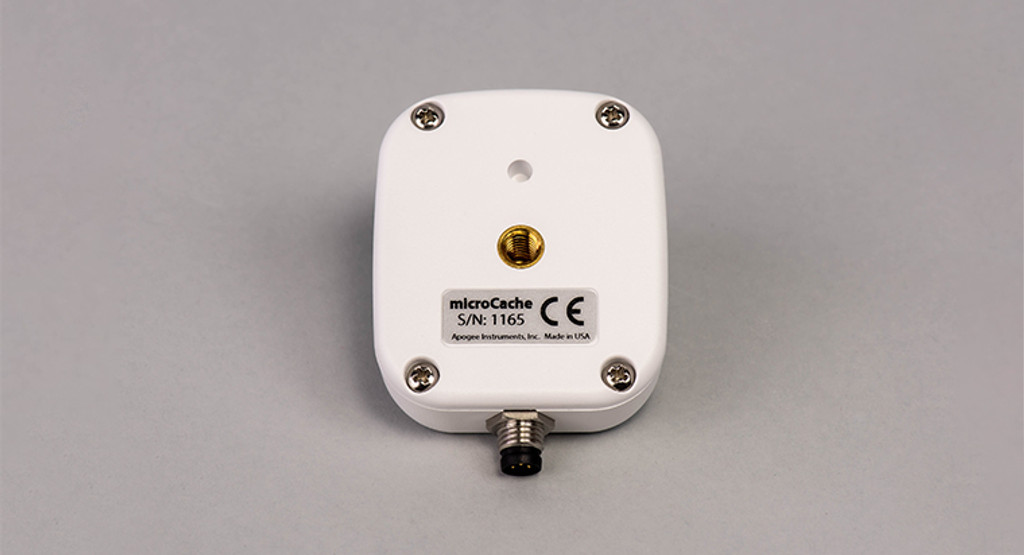 The AT-100 microCache (μCache) micro-logger is a rugged, standalone, battery-powered device that can collect over 400,000 data points. The microCache connects your sensor to your iOS or Android device via Bluetooth using our free ApogeeConnect app. The app allows you to make real-time measurements, set custom datalogging intervals, monitor and graph daily lights integrals, measure photoperiods, download datasets, and more.