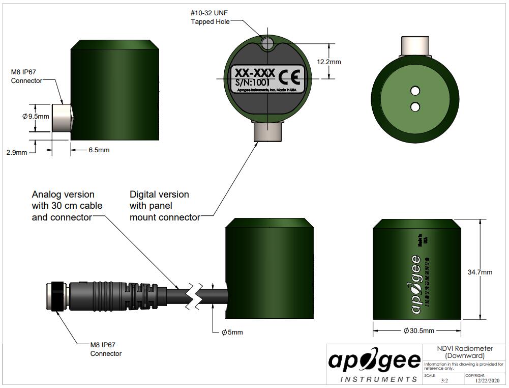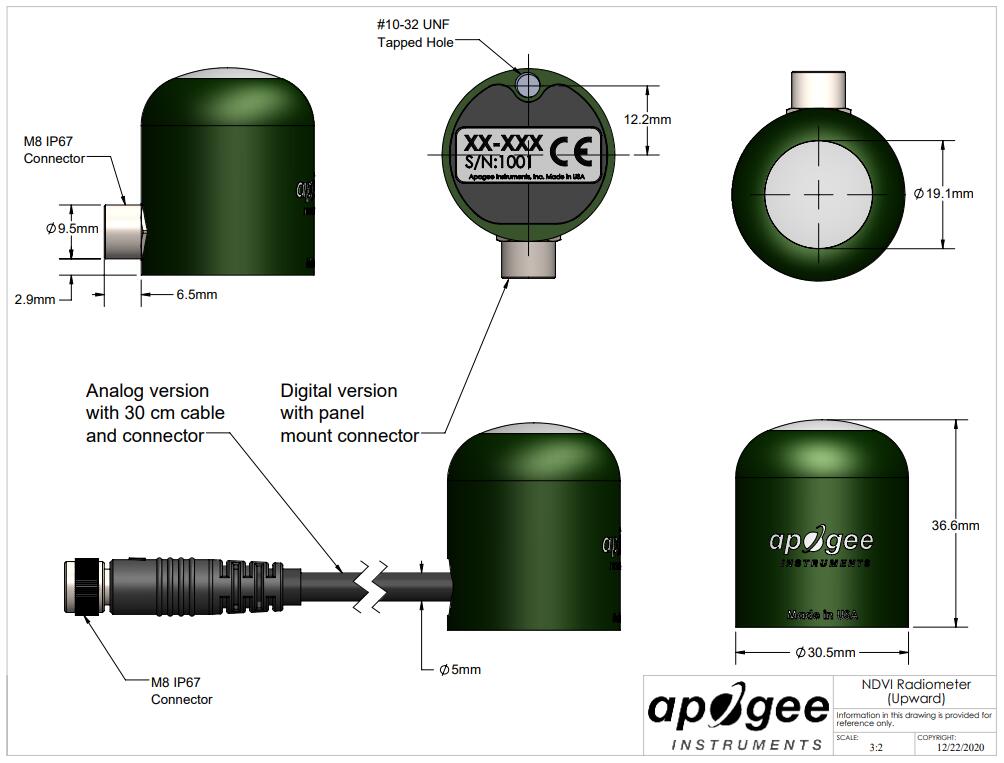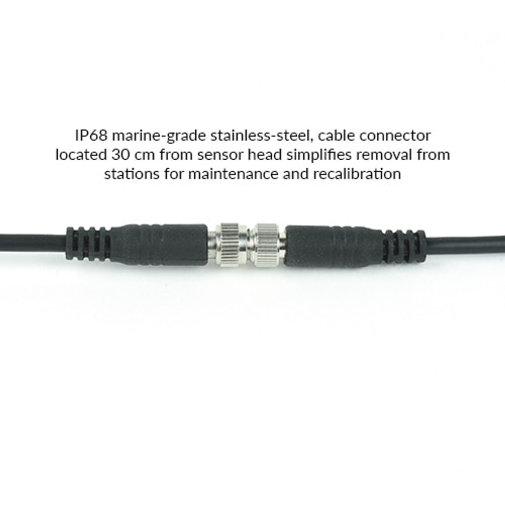 The analog version of this sensor (S2-111) comes with the inline cable connector placed 30 cm from the sensor head for either standard use as a long-cable pigtail sensor, or for use with our microCache Bluetooth Micro Logger by unscrewing the connector, discarding the long section of cable and then screwing the sensor to the mating connector on the microCache.