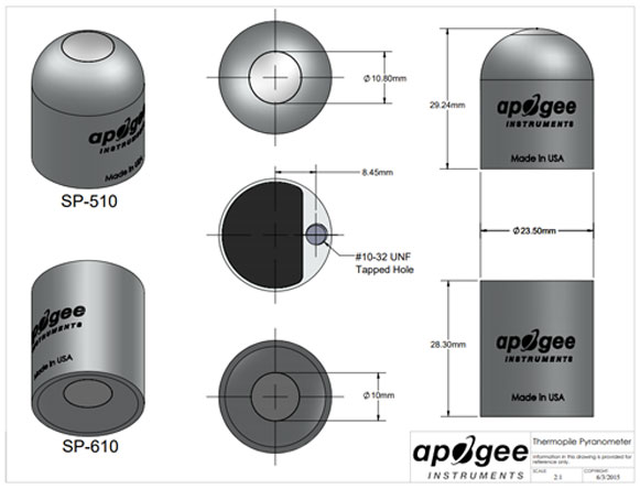 These sensors can also be coupled with our downward facing pyranometer to form an albedometer. For this application, we recommend the Apogee SP-710-SS Albedometer sensor package, which consists of one SP-510-SS upward-facing pyranometer, one SP-610-SS downward-facing pyranometer, an AY-001 differential splitter, and an AW-605-SS 5 meter cable. For mounting to a mast or directly to a solar panel, we recommend using either the AL-130 Albedometer mounting bracket or the AM-500 Net Radiometer mounting bracket paired with an AM-130 mounting fixture with 12" rod.