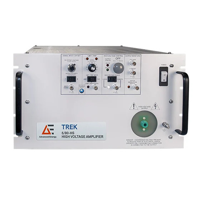 The DC-stable Trek 5/80-HS non-inverting, high voltage power amplifier can be used in various industrial and research applications including mass spectrometry, ion beam steering, and AC or DC biasing. Its four-quadrant, active output stage sinks or sources the current into reactive or resistive loads throughout the output voltage range. This allows you to achieve accurate output responses and high slew rates demanded by highly capacitive or reactive loads.