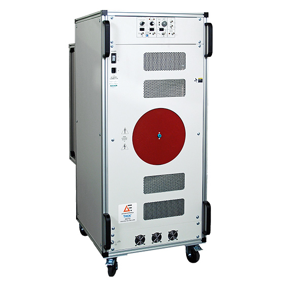 The Trek 50/12 DC-stable, high-voltage power amplifier features an all-solid-state design for high slew rate, wide bandwidth, and low-noise operation. It is designed to provide precise control of output voltages in the range of 0 to ±50 kV DC or peak AC with an output current range of 0 to ±12 mA DC or peak AC. The four-quadrant, active-output stage sinks or sources current to reactive or resistive loads throughout the output voltage range. This is essential to achieve accurate output responses and high slew rates demanded by reactive loads.