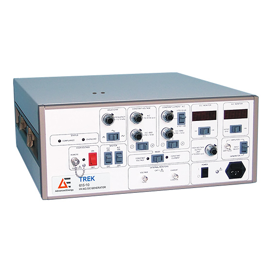 The Trek 615-10 is a precision high voltage AC-DC generator and amplifier system used in a broad range of R&D and production applications. In the constant voltage mode, the Trek 615-10 generates constant amplitude waveforms with or without DC bias. In the constant current mode, it generates constant amplitude AC current waveforms, with or without DC bias. In amplifier mode, an analog voltage input connector is provided to apply external AC or DC signals.