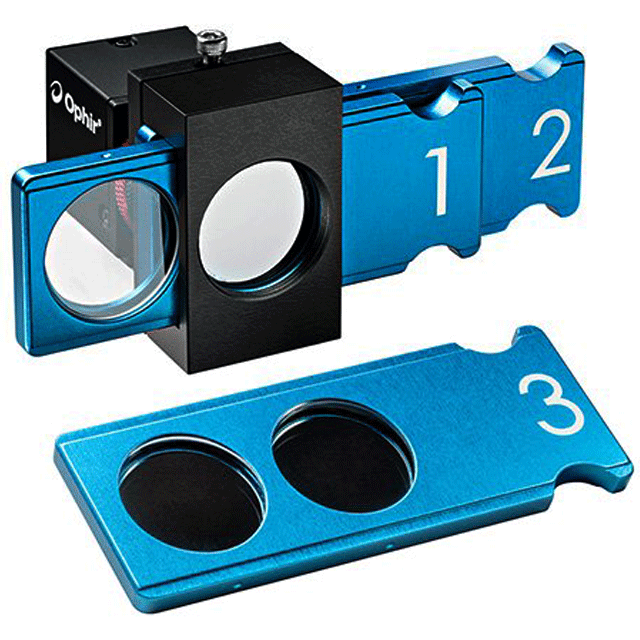 C-mount interface for universal application to our CCD and Pyroelectric cameras 190-380nm attenuation covers Excimer, Helium Cadmium, and the Nd:YAG UV harmonic laser wavelengths. Attenuation with these ND filters permits the best use of the dynamic range of a beam profiling camera. Attenuation range of 0.3 to 6.0 optical densities (ND). Set consists of three slides with two filters in each slide.
