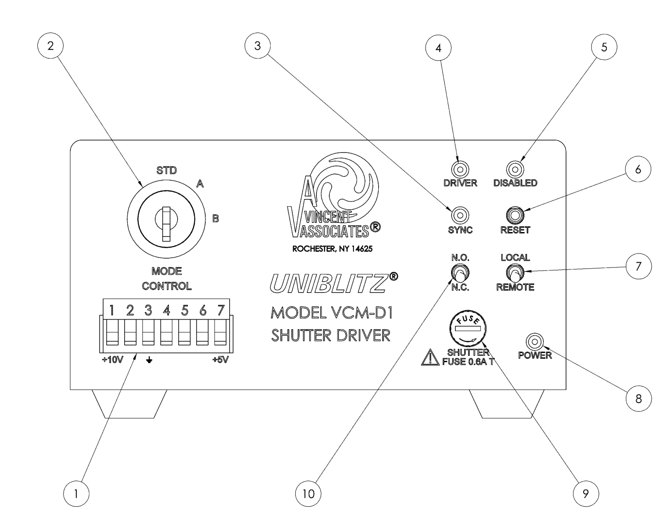 N.O./N.C. Switch (10) | The position of this switch determines shutter status BEFORE a trigger signal is received by the VCM-D1. |