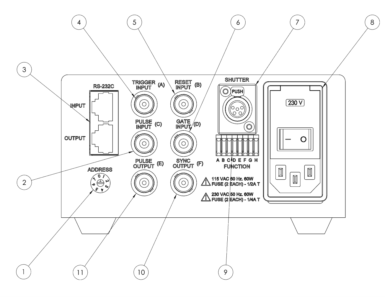 Gate Input (6) | The presence of an active signal will enable trigger signals presented to the Trigger Input BNC. |