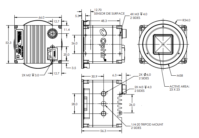 What is the distance from the front of the camera to the sensor?The distance from the front of the camera to the sensor is nominally 12.7mm, not including the SM2 adapter.